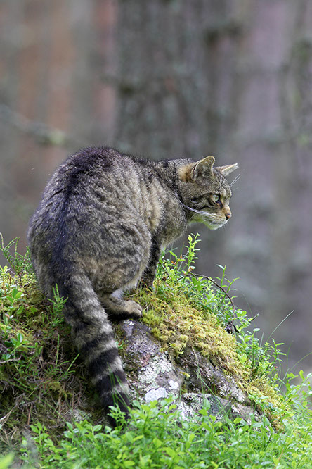 Scottish Wildcat (Felis silvestris) in pine forest. Scotland, July - © Mark Hamblin.